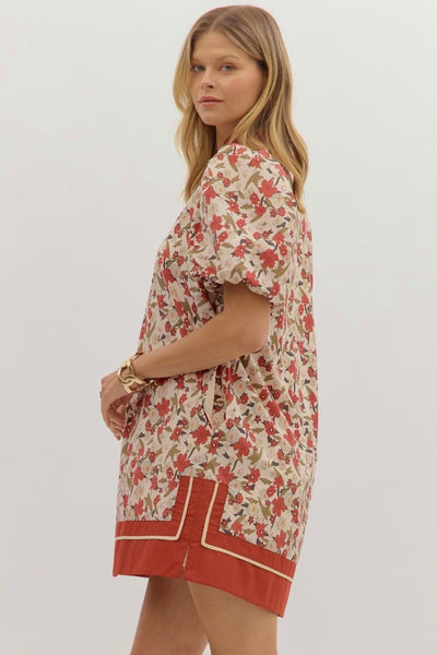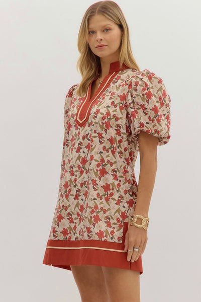Embrace effortless elegance with Rust Floral Puff Sleeve Mini Dress. Crafted from soft cotton, this dress features charming puff sleeves and a flattering mini length, perfect for warm days and casual outings. The rich dark rust floral pattern adds a touch of vintage-inspired beauty, making it a versatile piece for your wardrobe. Whether you're strolling through the city or enjoying a weekend brunch, this dress combines comfort and style to keep you looking effortlessly chic. This dark rust dress features a floral print throughout, solid rust trim, a notch v-neckline, beige trim details, puff sleeves, and two functional side pockets.