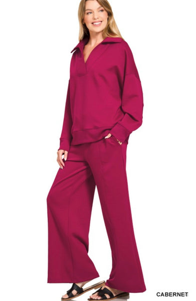 Experience unparalleled comfort and style with our collared lounge set, featuring a modern scuba collared pullover paired with matching pants. This coordinated set offers a sleek silhouette while providing cozy warmth and effortless versatility, making it perfect for relaxing at home or stepping out in casual-chic fashion. Elevate your everyday wardrobe with this refined, easy-to-wear combination designed for both comfort and confidence.