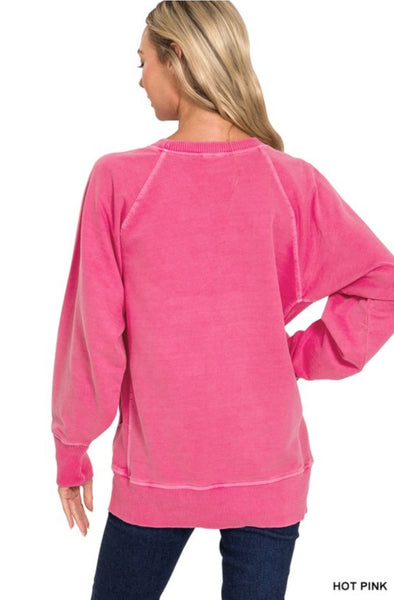 ACID WASH ROUND NECK PULLOVER WITH POCKETS. RIBBED DETAIL.