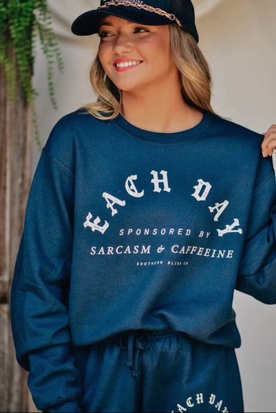 For the girl whose personality runs on equal parts quick wit and strong coffee. Our “Each Day Sponsored by Sarcasm & Caffeine” crewneck in rich navy is a cozy essential with a side of sass. Super soft fleece and a relaxed fit make this your new go-to for conquering the day.