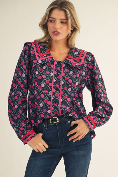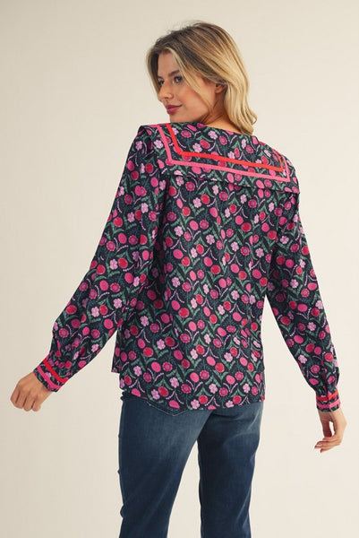 Make a bold statement with the Black Poppy Peter Pan Collar Top, where vibrant florals meet striking contrast. Featuring a rich black base scattered with pink and purple blossoms, this top is elevated with striking contrast trim and a chic structured collar. Perfect for both day-to-night wear, it’s equal parts playful and sophisticated.