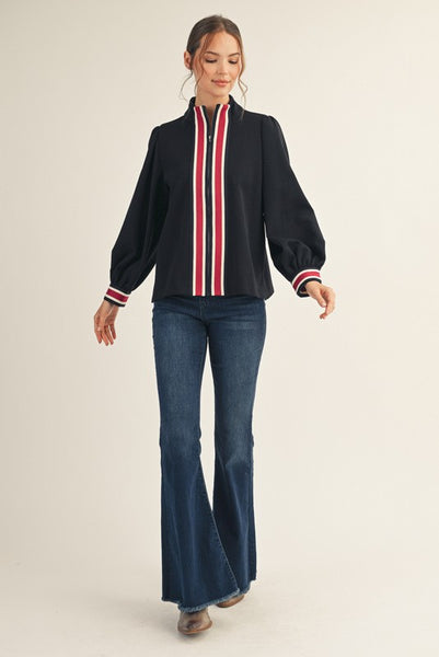 Elevate your everyday look with this chic black blouse featuring an elegant red stripe trim band. This top blends comfort with timeless style. The long balloon sleeves add a feminine touch, making it perfect for dressing up with slacks or keeping casual with denim. Lightweight and versatile, this blouse is a wardrobe staple you’ll reach for all year long.