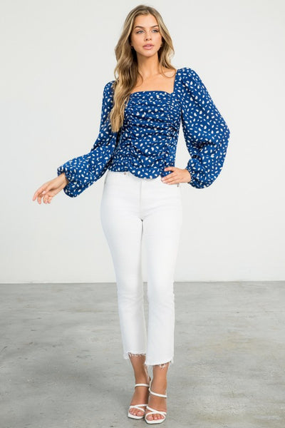 Turn heads in this chic blue blouse featuring a playful white dot print. The flattering square neckline pairs beautifully with the ruched bodice for a figure-enhancing fit, while the long puff sleeves add a touch of elegance. Made from lightweight fabric, this top transitions seamlessly from day to night—perfect for pairing with jeans or dressing up with a skirt and heels.