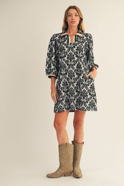 Classic meets casual in our Black and White Damask Zip Dress. This easy, throw-on-and-go piece features a soft neutral base with a bold black damask design that adds instant polish. The relaxed shift fit keeps it comfortable, while the zip neckline and contrast trim give it that effortlessly chic edge. Pair it with booties for a lunch date or dress it up with heels for an evening out — it’s the perfect blend of style and ease.
