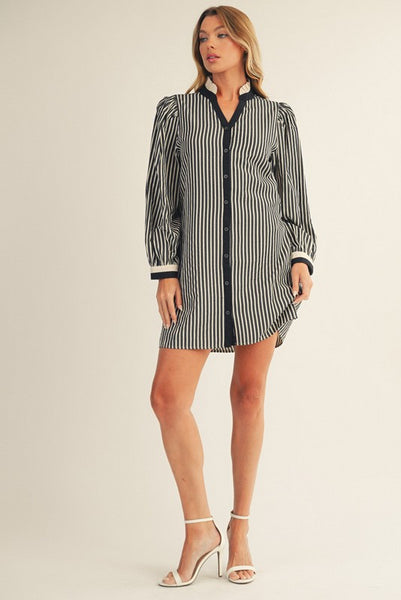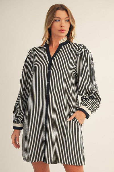 Meet your new go-to for effortless style. Designed with timeless black and cream stripes, this dress features a relaxed, easy fit with subtle puff sleeves for a touch of feminine flair. The button-front detail and contrast trim keep it classic yet modern, perfect for everyday wear or dressed up with boots and a crossbody. Comfortable, chic, and endlessly versatile — Harper makes casual look polished.