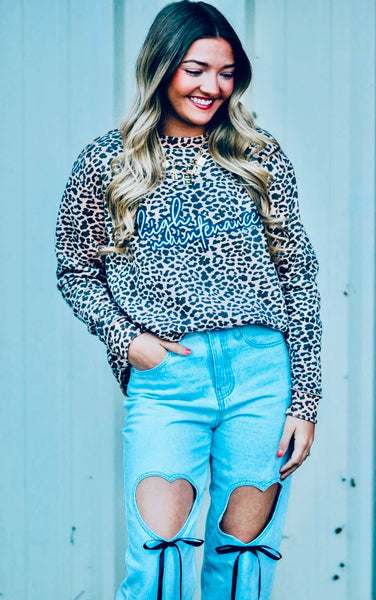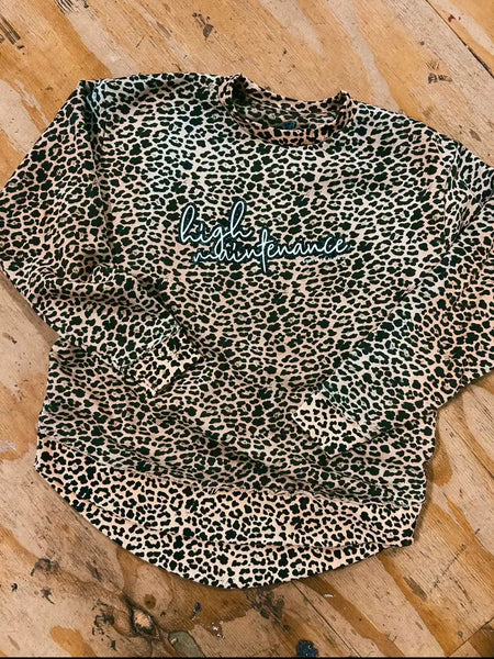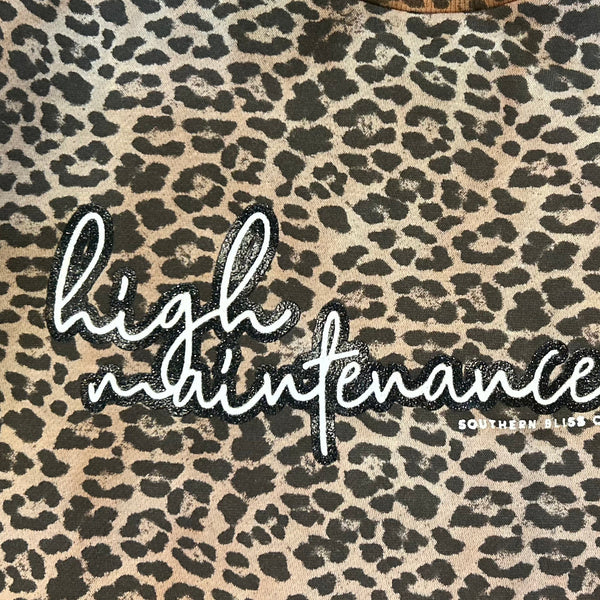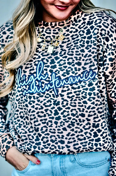 Embrace your unique style with our High Maintenance Black Glitter Leopard Sweatshirt. It blends comfort with a touch of glam with its bold leopard print accentuated by sparkling black glitter, making it a standout piece for any casual occasion.